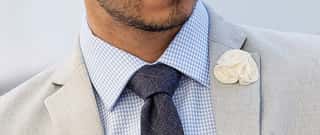The original accessory, a boutonniere is a real flower that sits in the buttonhole, adding an unmissable touch to your jacket. Usually used at weddings.